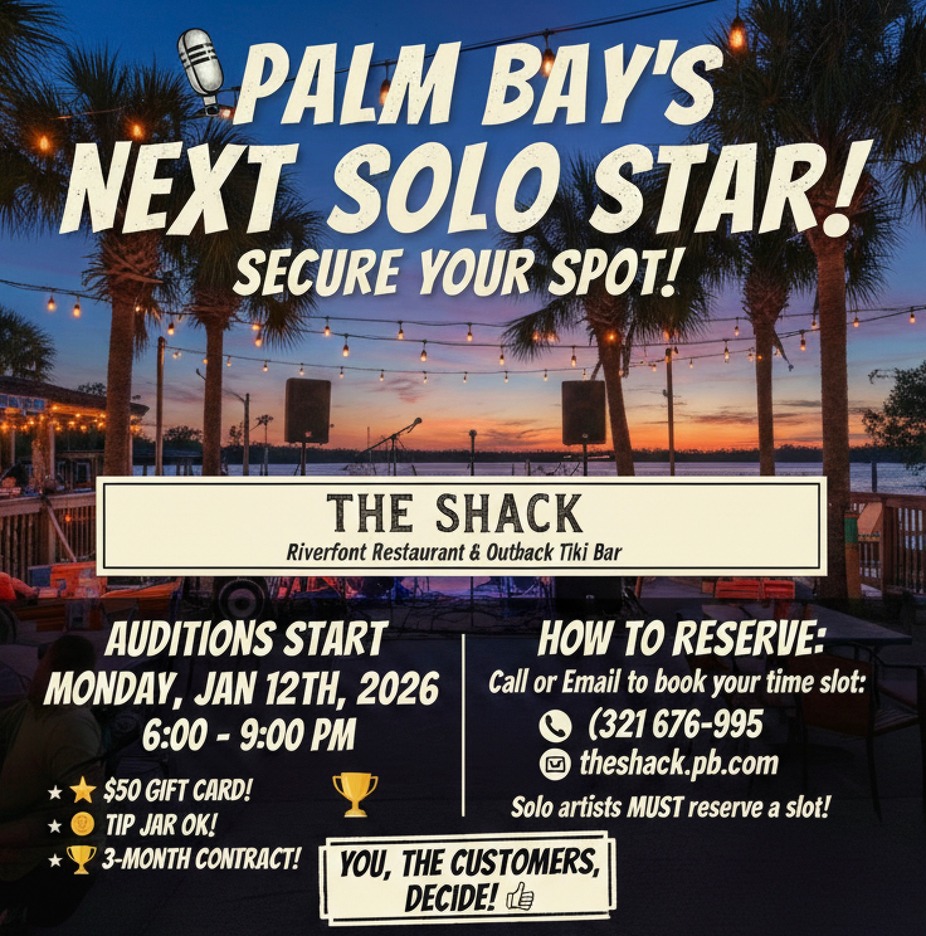 🎤🌟 Palm Bay's Musical Showdown #2 is here! 🌟 Congrats to Tom Llinas, our Solo Star Auditions #1 winner! Thanks to everyone who voted. See Tom perform on January 5th from 5:00 pm to 9:00 pm! 🎸✨ Calling all musical talents! The Shack Riverfront Restaurant & Outback Tiki Bar is searching for Palm Bay's next star. Auditions start January 12th, 2026, from 6-9 PM. Win a thrilling 3-month gig in 2026! 🎶🎤 📍 Location: 4845 Dixie Hwy N E, Palm Bay ✨ Perks for Participants: - $50 gift card - Tip jar earnings - Chance to win a 3-month contract 🗓️ Competition Schedule: - Jan 12th: Auditions begin - Jan 19th, 26th, Feb 2nd: Melodious duels - Feb 9th: Grand Finale Join us every Monday to vote for your favorite! 🌟