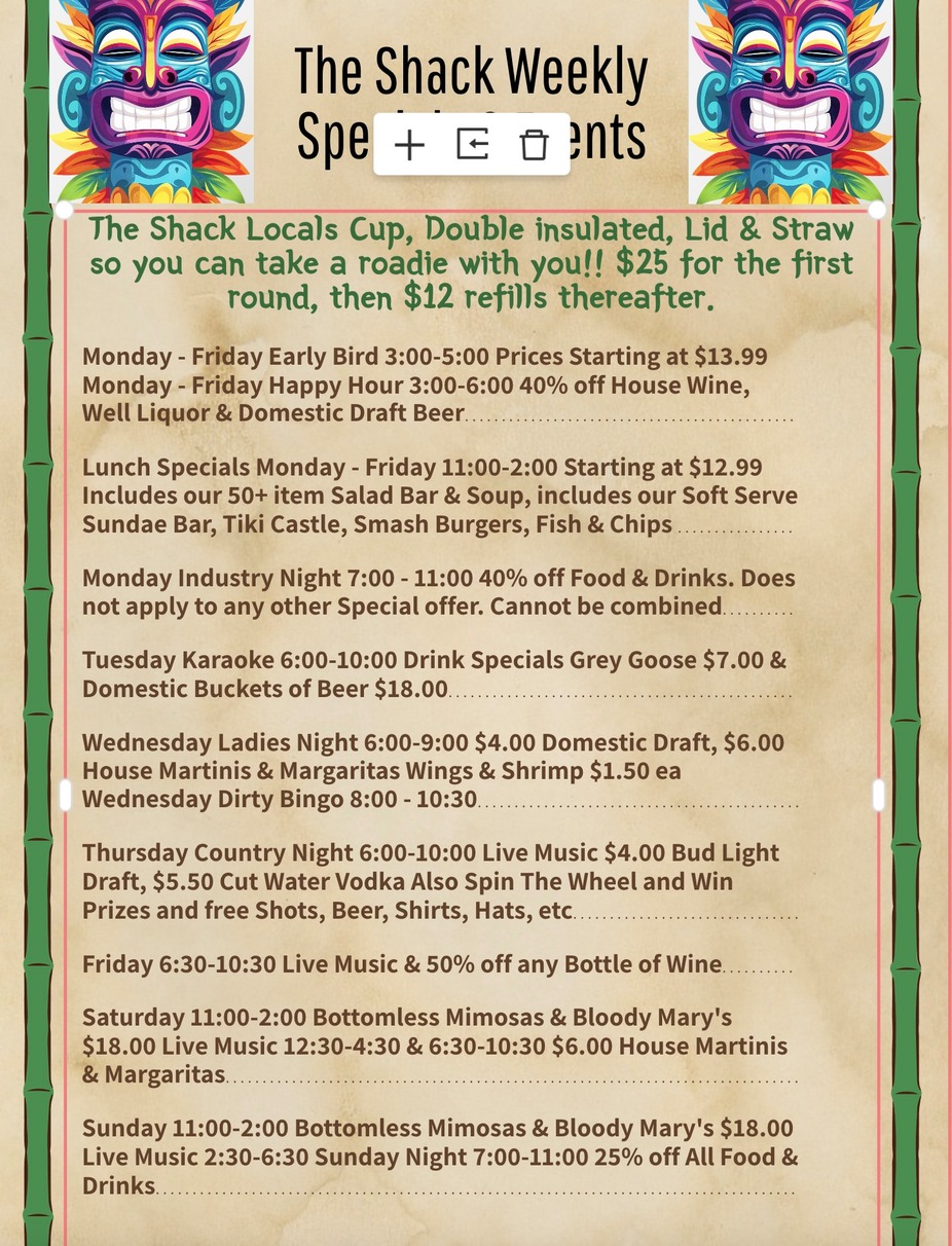 🍳 Weekend Specials Just Got Better! 🥂 @ The Shack Riverfront Tiki Bar!